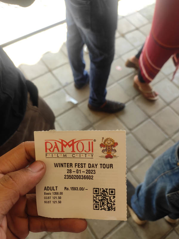 The Taxi driver convinced us to purchase the tickets at Rs. 1,650 per head on the way, with his incongruous agent, to avoid waiting in the long queues at Ramoji. This would dramatically shorten the wait time. We obliged. The commission difference was negligible. After traversing though the city and some more towards the Vijaywada highway, we duly arrived at Ramoji Film City by 11:00 am. A massive signage signals the grand location. It is the largest film studio complex in the world, spread across an astonishingly vast area.