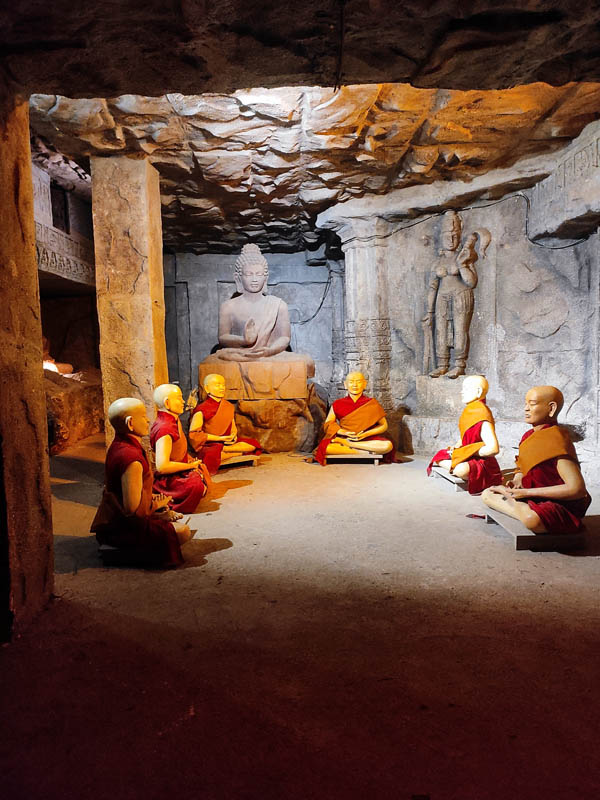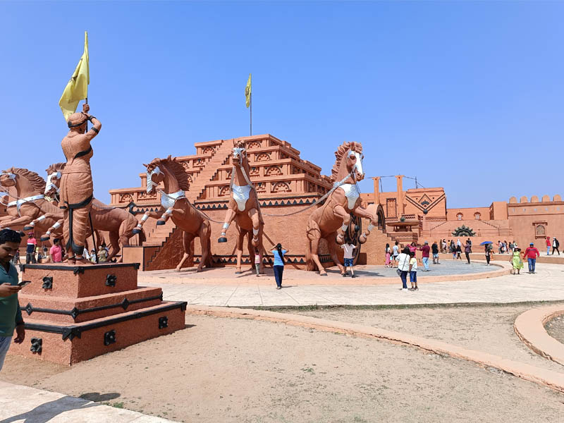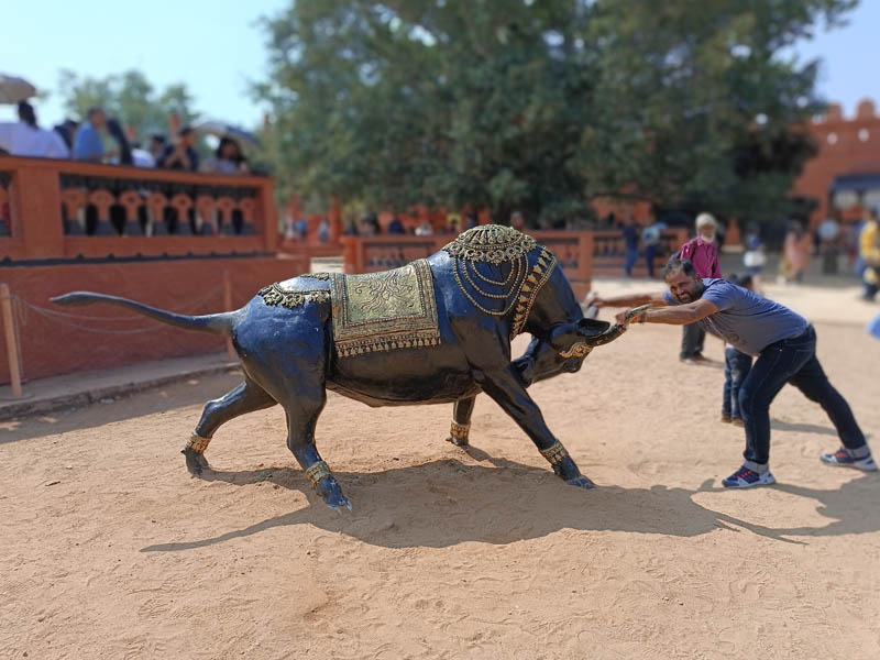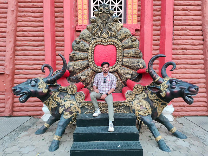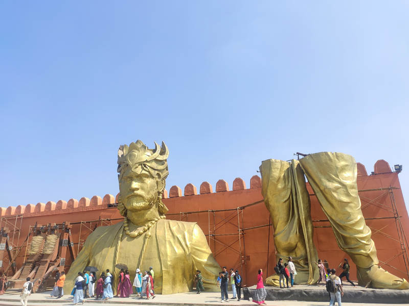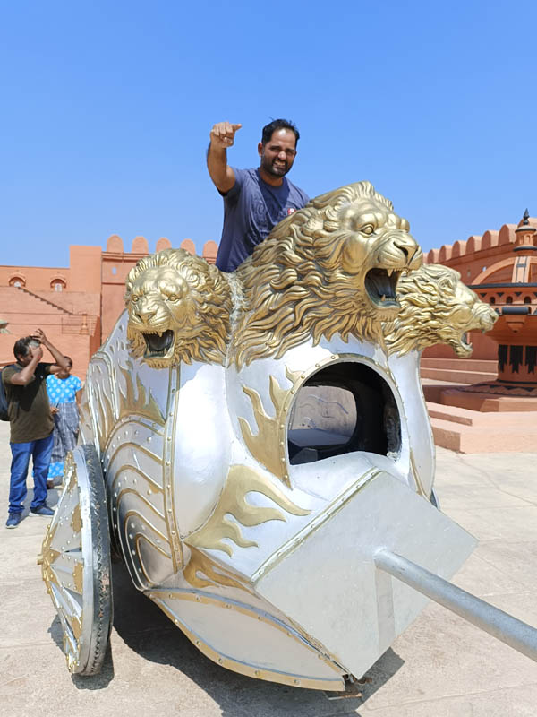 The next bus took us to the magnificent movie sets of Bahubali. All the mannequins, statues, chariots, bulls that were used in the movie sets, are placed. The larger-than-life size statues draw collective gasps from the onlookers. The statues are intimidating. There is also a throne, which had a beeline for photographs. Our group, just like all the tourists, indulged in infinite photographs. Sanit, especially, is bit of a selfie junkie, who loves standing throbbing pic of himself in various styles.