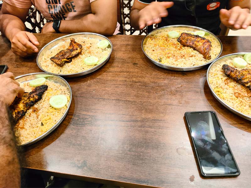 As we entered, it surprised us to see that it was nothing like a typical restaurant. Practically, there were just 2 table with chairs, while the rest of the area had been converted into sit-out with blankets laid on the floor. A typical Arabic styled hotel. Further surprises awaited us. The hotel served what they called as the Mandi thali. It comprised of 1 big plate full of Biryani rice, with 2 massive sized chicken leg pieces. The portion easily served for 2-3 people. And that what the patrons did. At every sit out, there were groups, who ate from the same plate, sharing the dine-in space. It was an unbelievable sight, which literally took our breath away. We almost waltzed through the door, until Mayur decided to check with the waiter, if dinner can be served in separate plates. Astonishingly, he had to check with the manager, to ascertain if our request was allowed. He finally relented. Food was sumptuous. Except Sanit, who was following veg Saturday, we all had our fill.